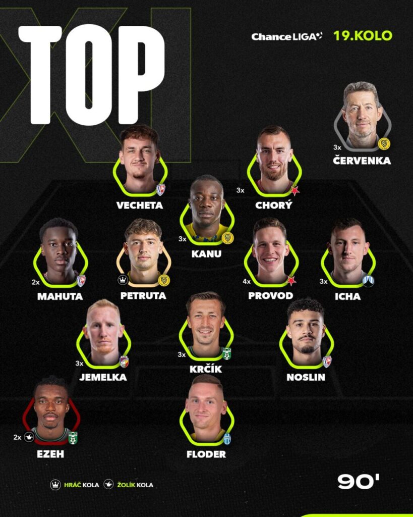 Liga nám třetí adventní víkend přinesla poslední 19. kolo Chance Ligy. K vidění bylo mnoho dominantních výsledků, mezi něž patří střelnice na zlínské Letné nebo pardubická dominance v Ostravě. Chybět ani tento týden nesmí nejlepší jedenáctka kola, od které si na necelé dva měsíce dáme pauzu.